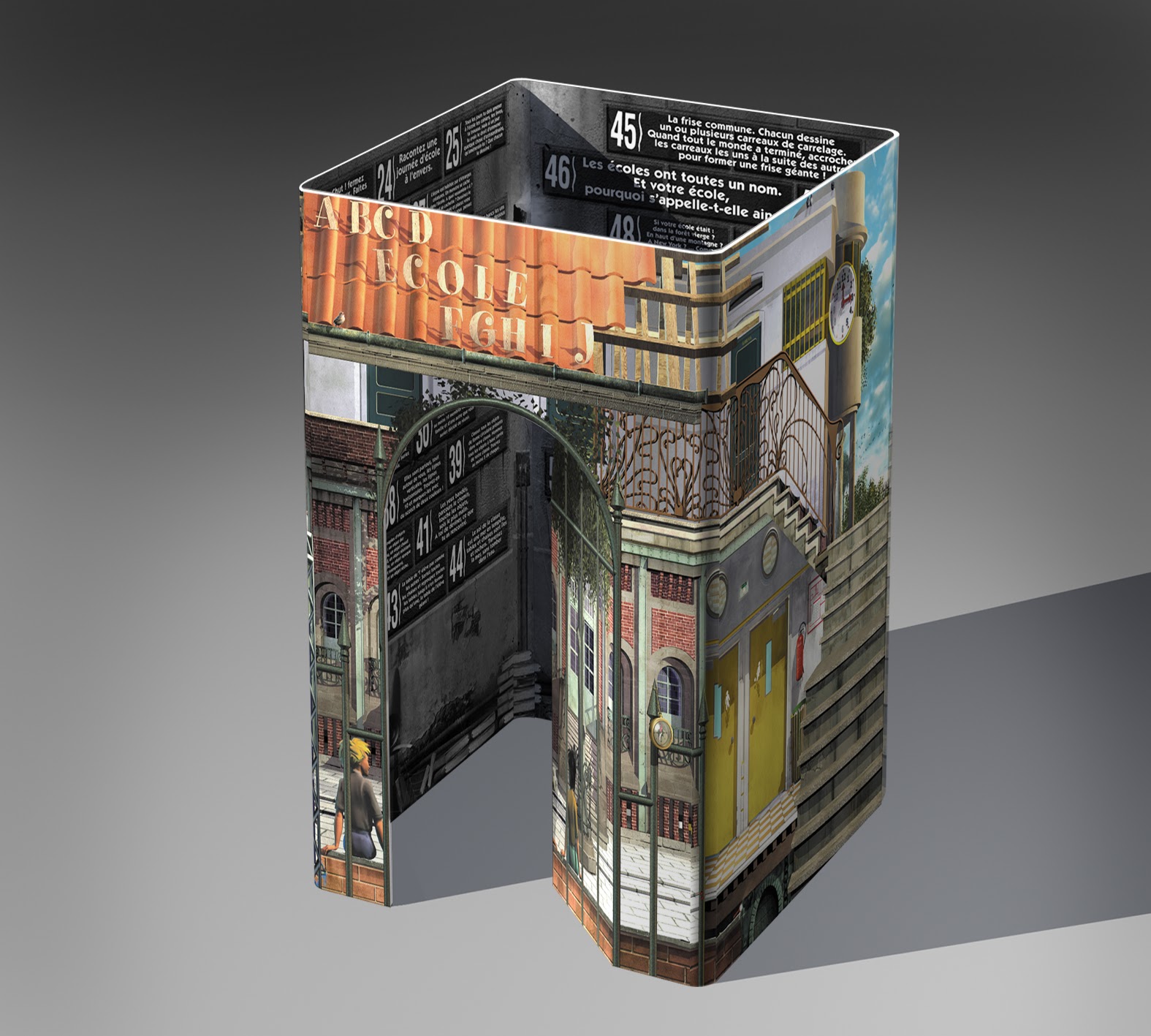 « L’ÉCOLE » Livre jeu en forme de boîte en carton plié, atteignent 120 x 80 cm.