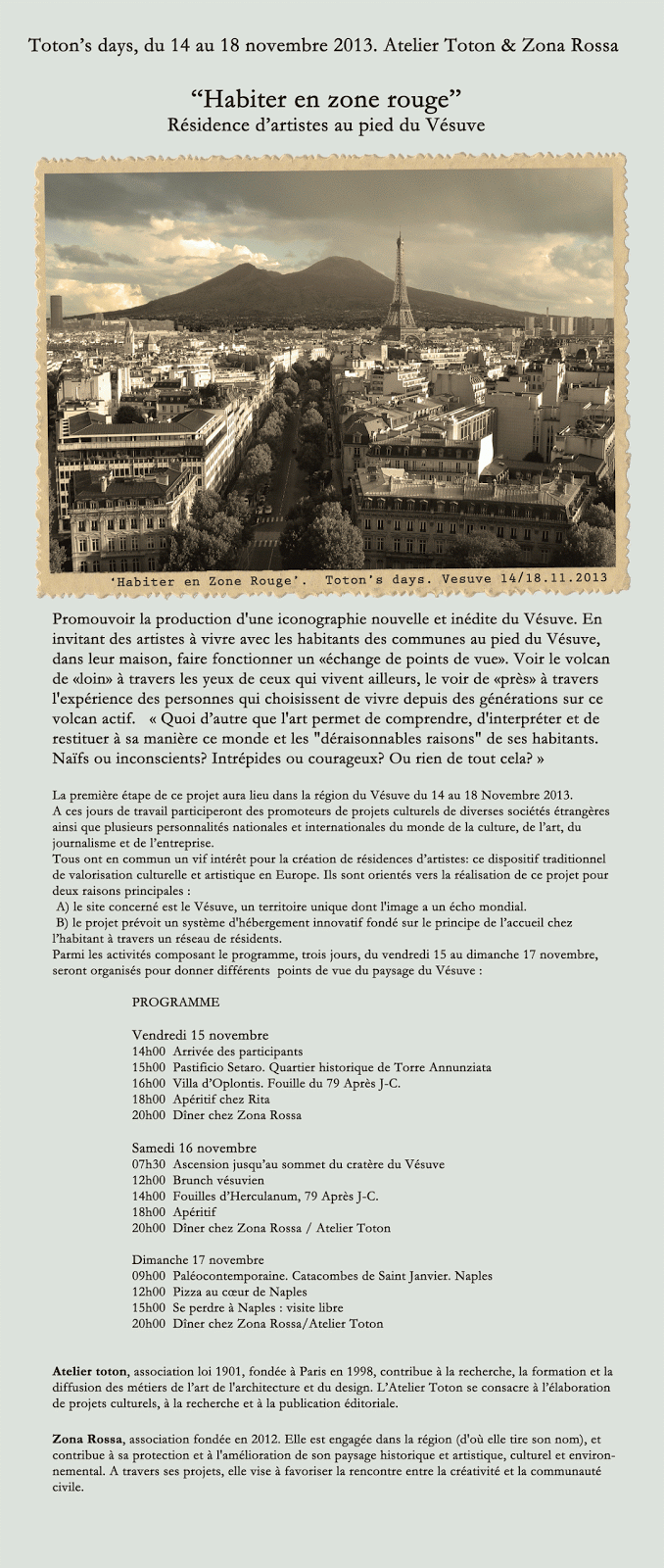 Le TOTON’s Days, rassemblement annuelle de la famille Toton, cette année, prend la forme de « HABITER la Zone Rouge». Lancement d’un projet de résidences d’artistes, chez les habitants, au pied du Vésuve.